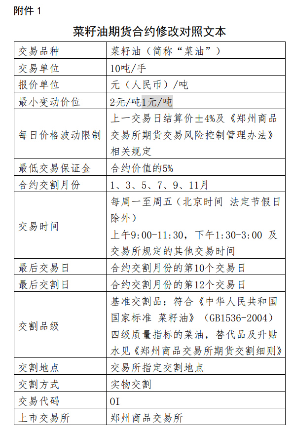 附件:1.菜籽油期貨合約修改對照文本