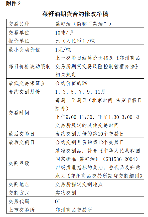 關(guān)于公布菜油期貨合約修訂事項的通知